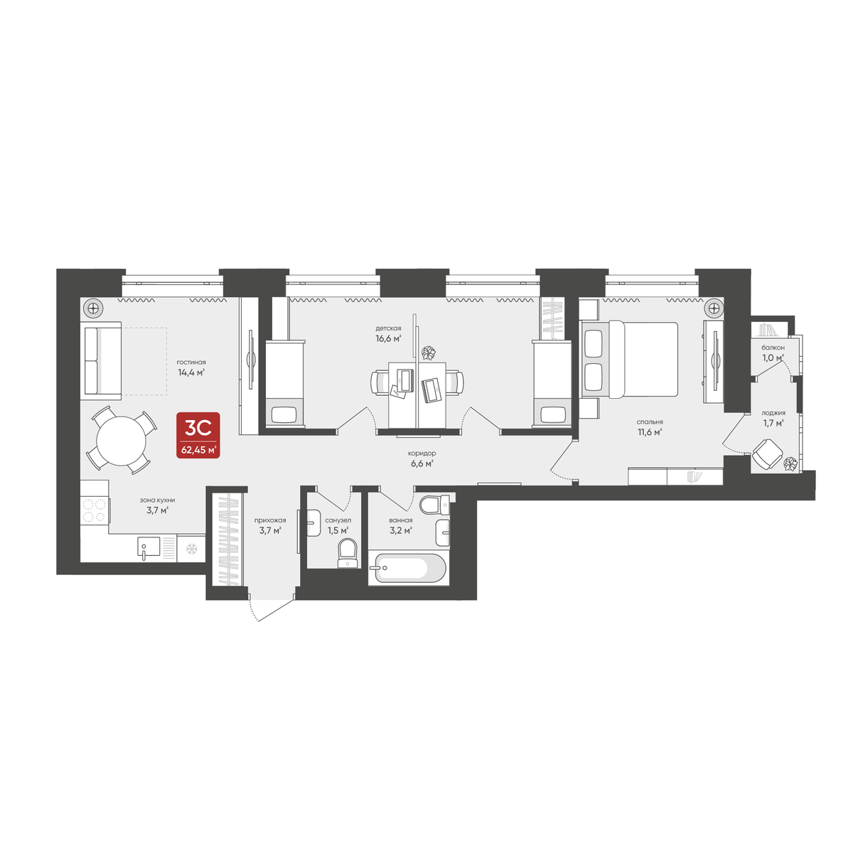 3-комнатная, 62.45 м², № 115