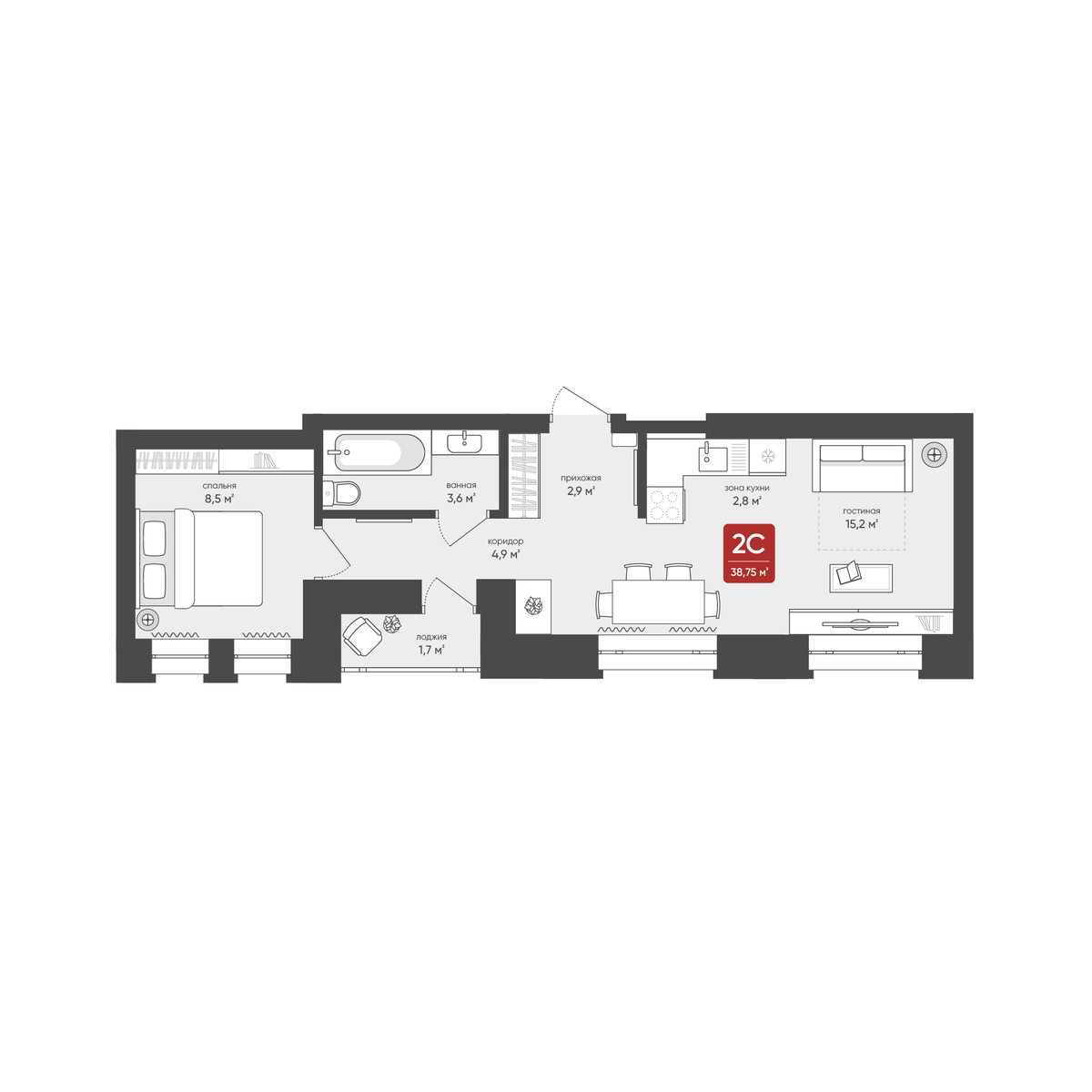 2-комнатная, 38.75 м², № 117