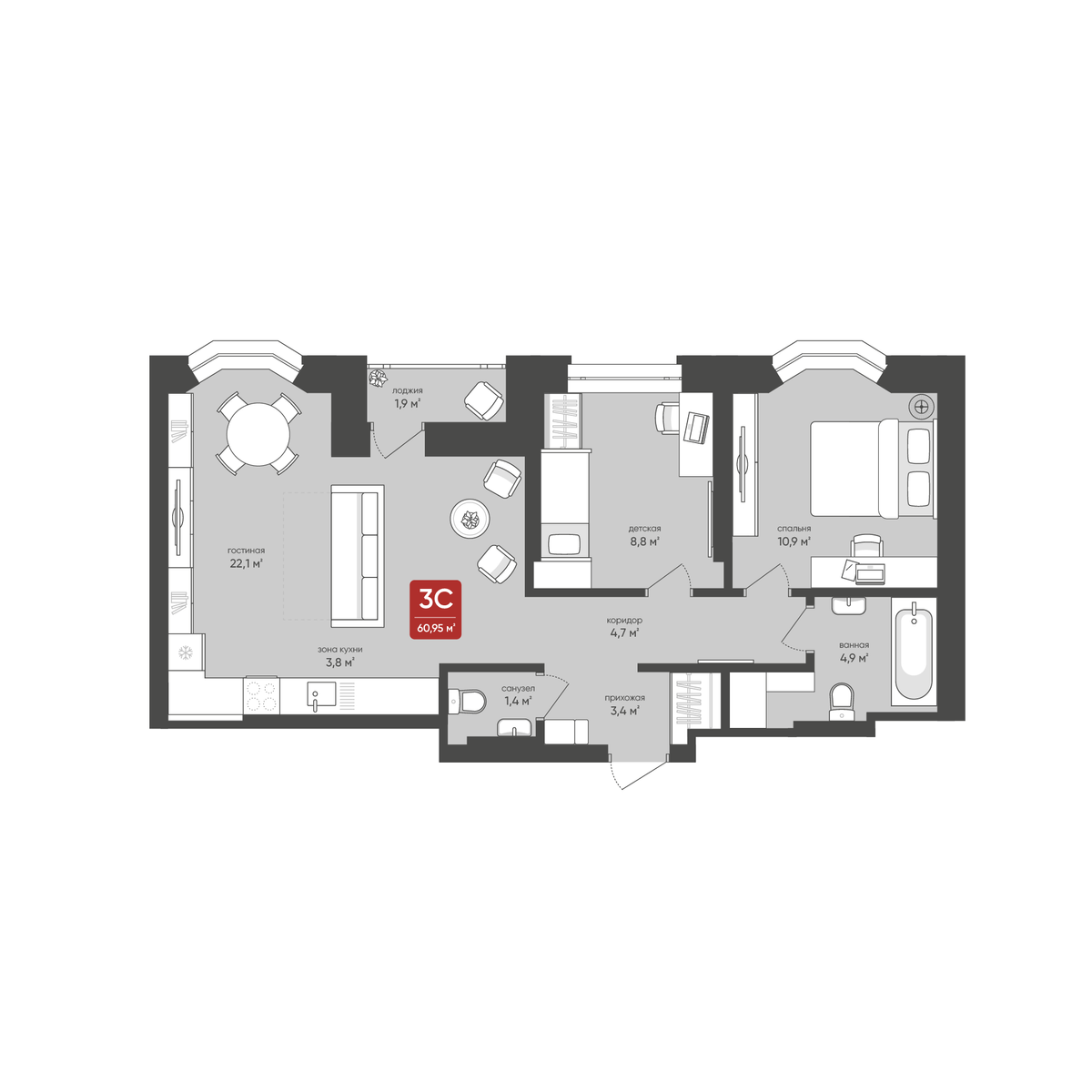 3-комнатная, 60.95 м², № 127