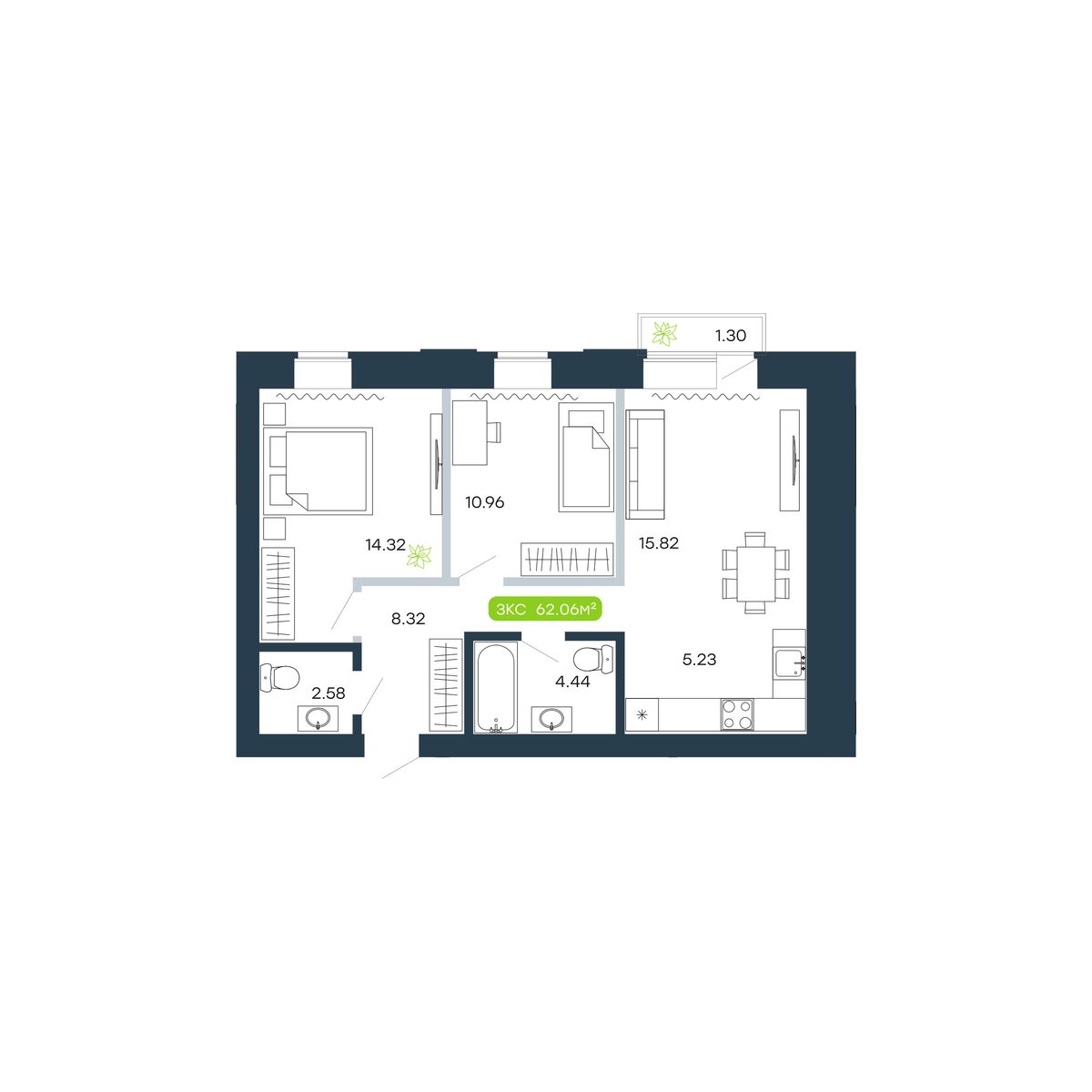 3-ΠΊΠΎΠΌΠ½Π°ΡΠ½Π°Ρ, 62.06 ΠΌΒ², β 26
