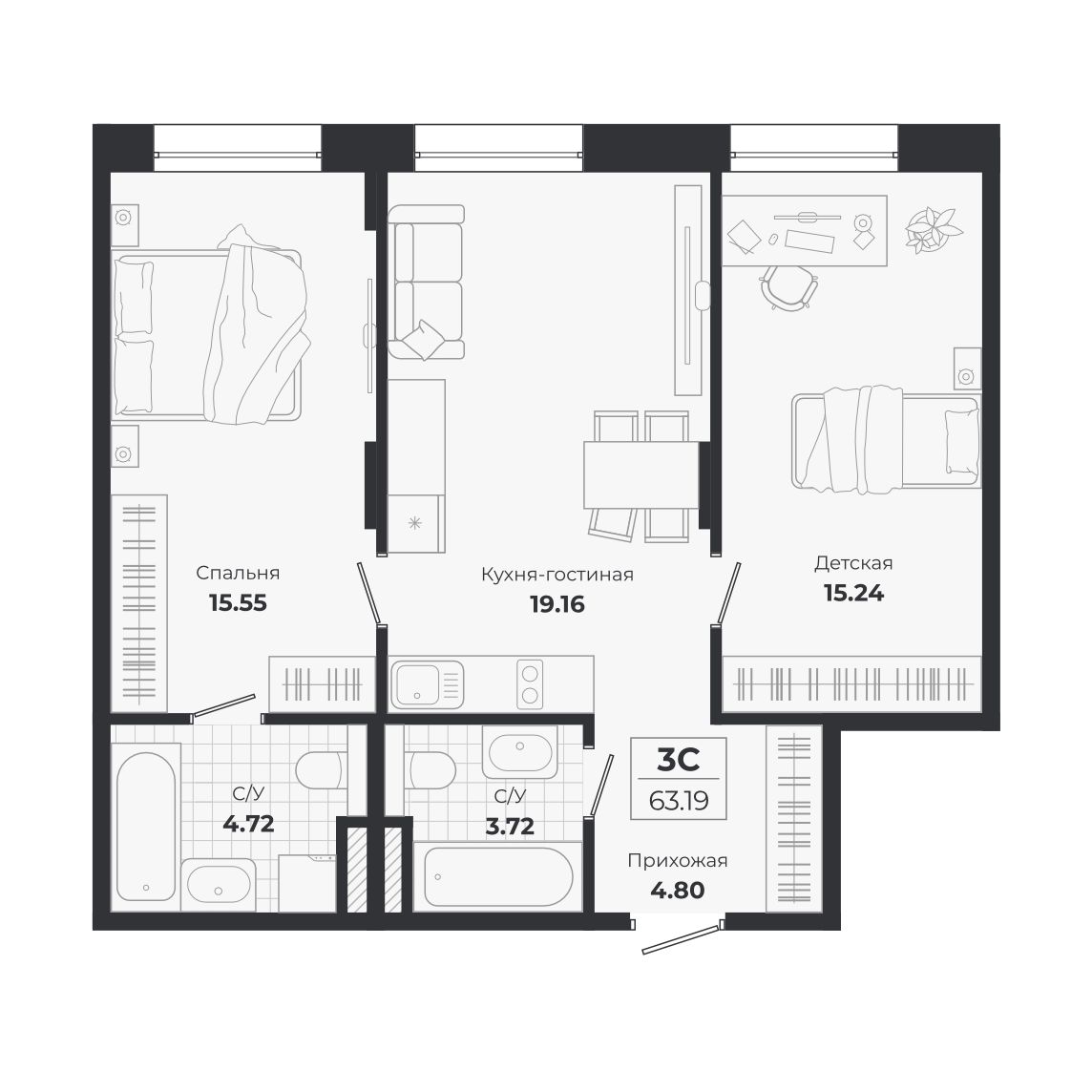 3-комнатная, 63.19 м², № 911