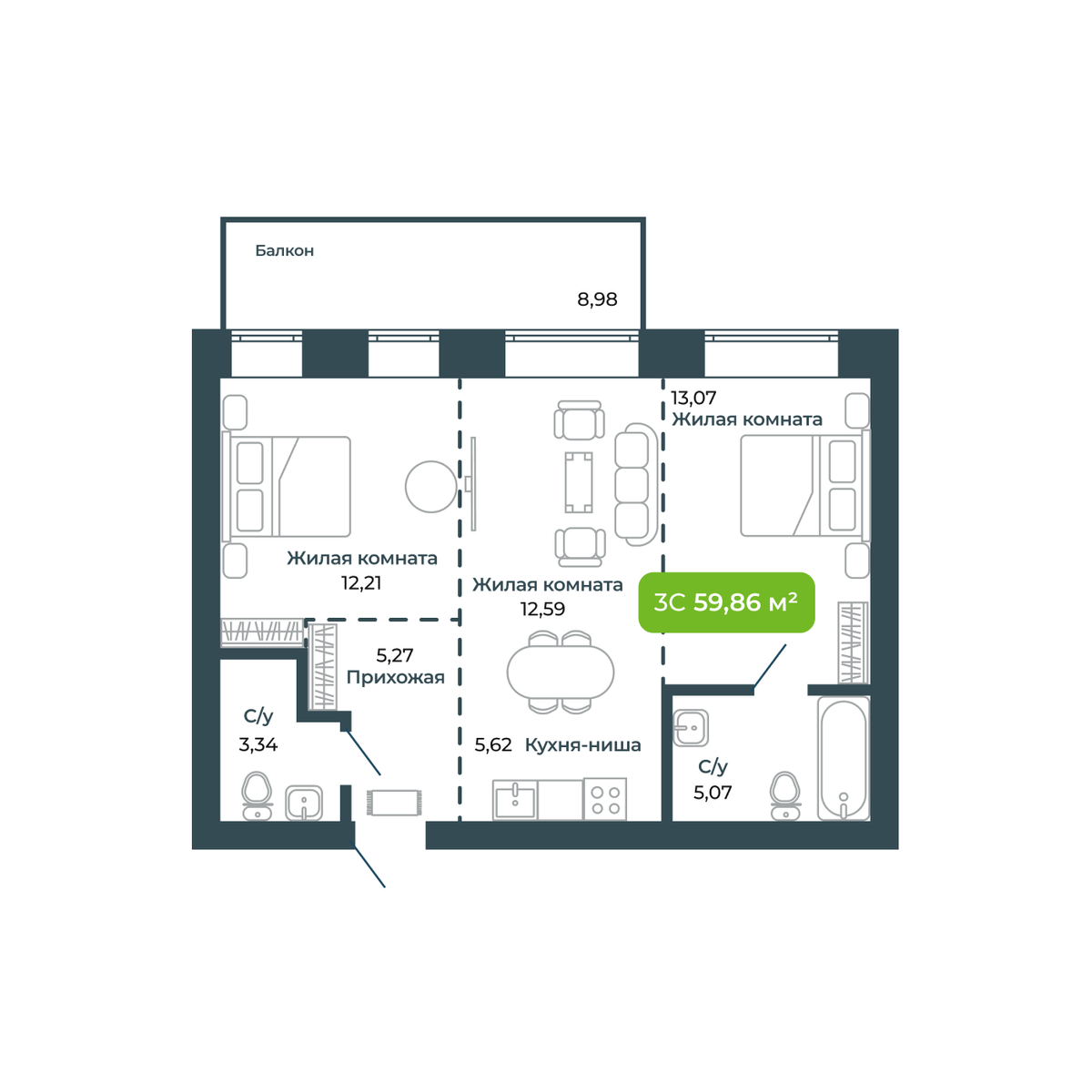 3-ΠΊΠΎΠΌΠ½Π°ΡΠ½Π°Ρ, 59.86 ΠΌΒ², β 25