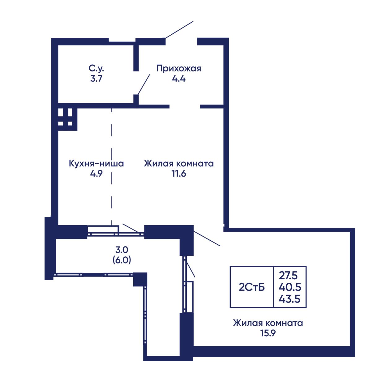 2-ΠΊΠΎΠΌΠ½Π°ΡΠ½Π°Ρ, 43.5 ΠΌΒ², β 850