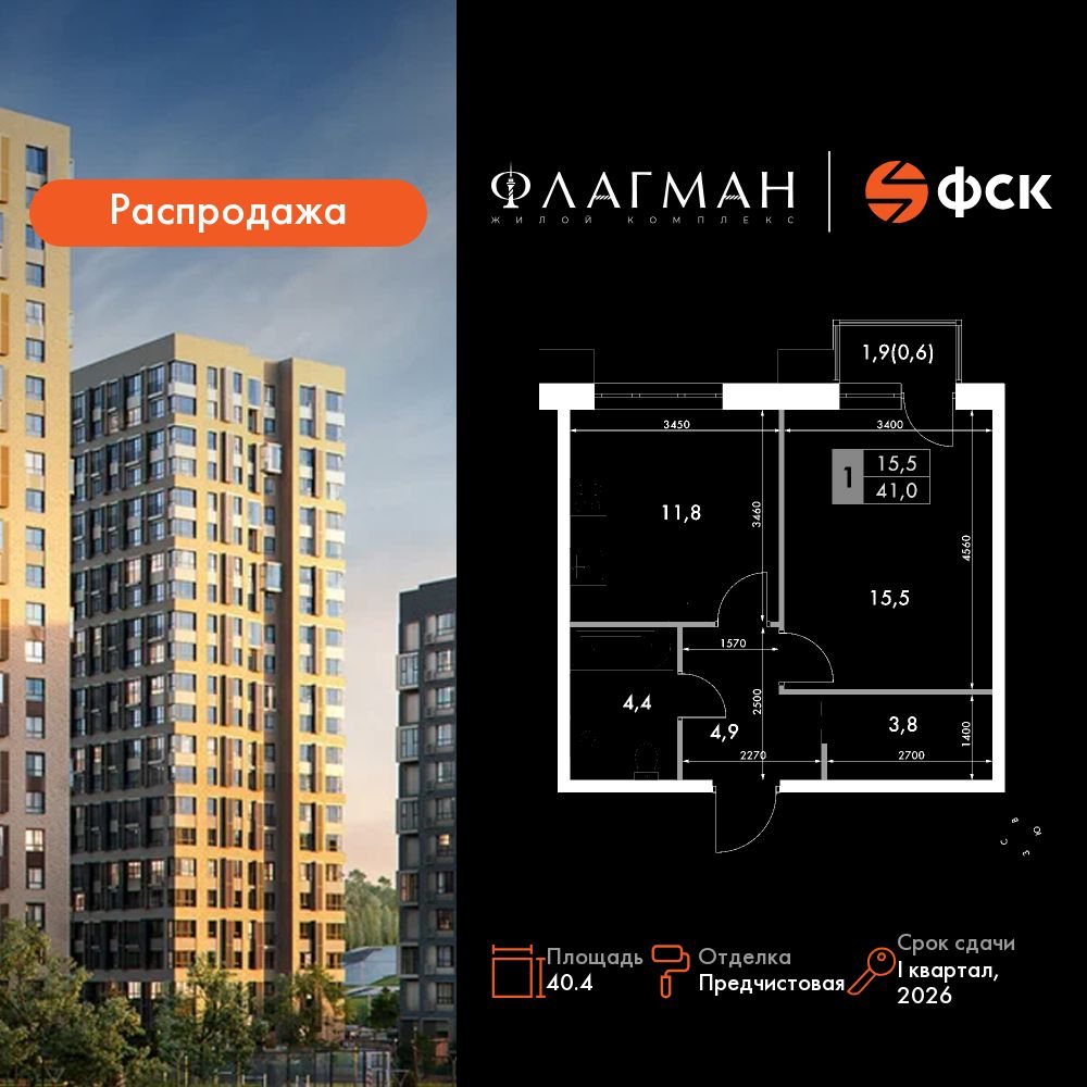 1-ΠΊΠΎΠΌΠ½Π°ΡΠ½Π°Ρ, 40.4 ΠΌΒ², β 440