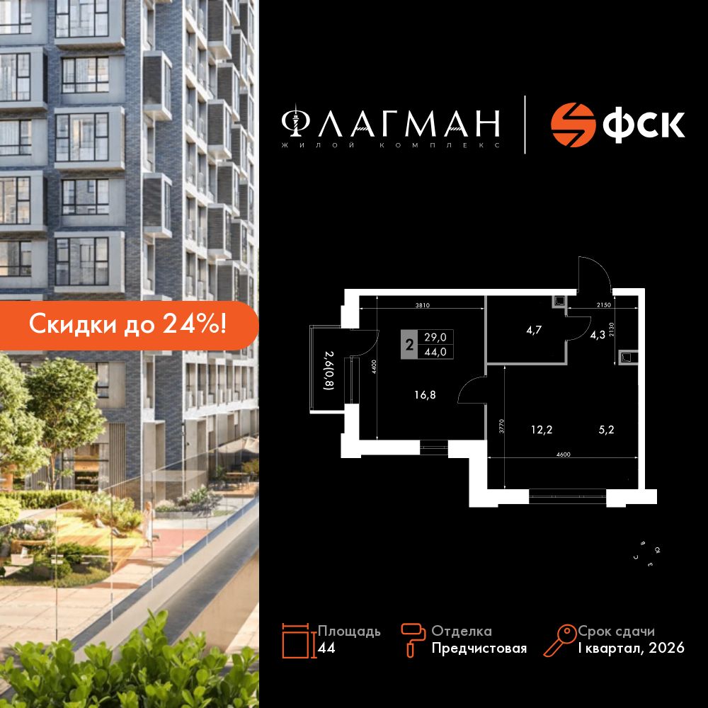 2-комнатная, 44 м², № 611