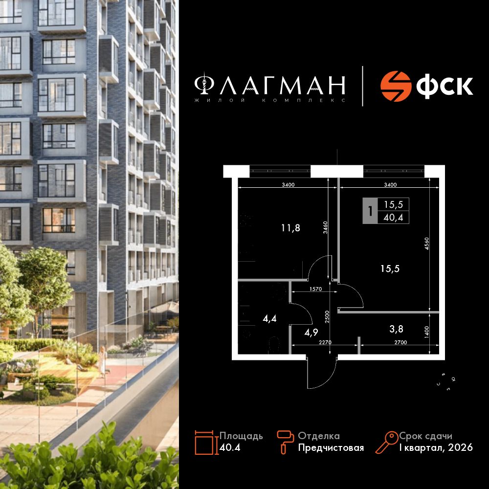 1-комнатная, 40.4 м², № 368