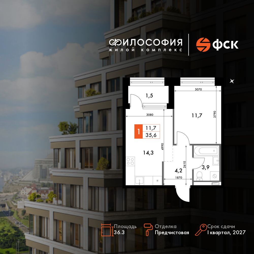 1-комнатная, 36.3 м², № 126