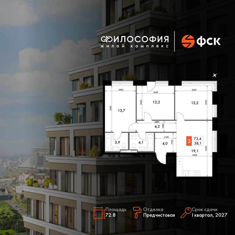 3-комнатная, 72.8 м², № 414