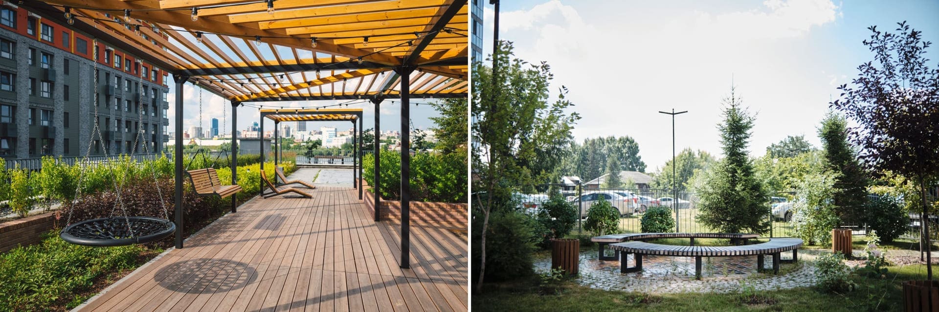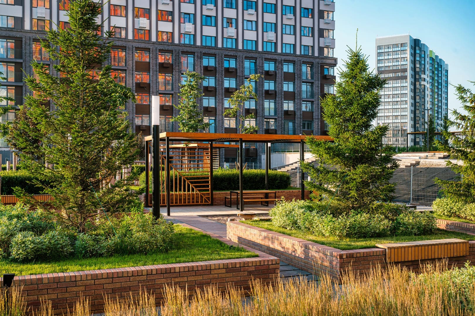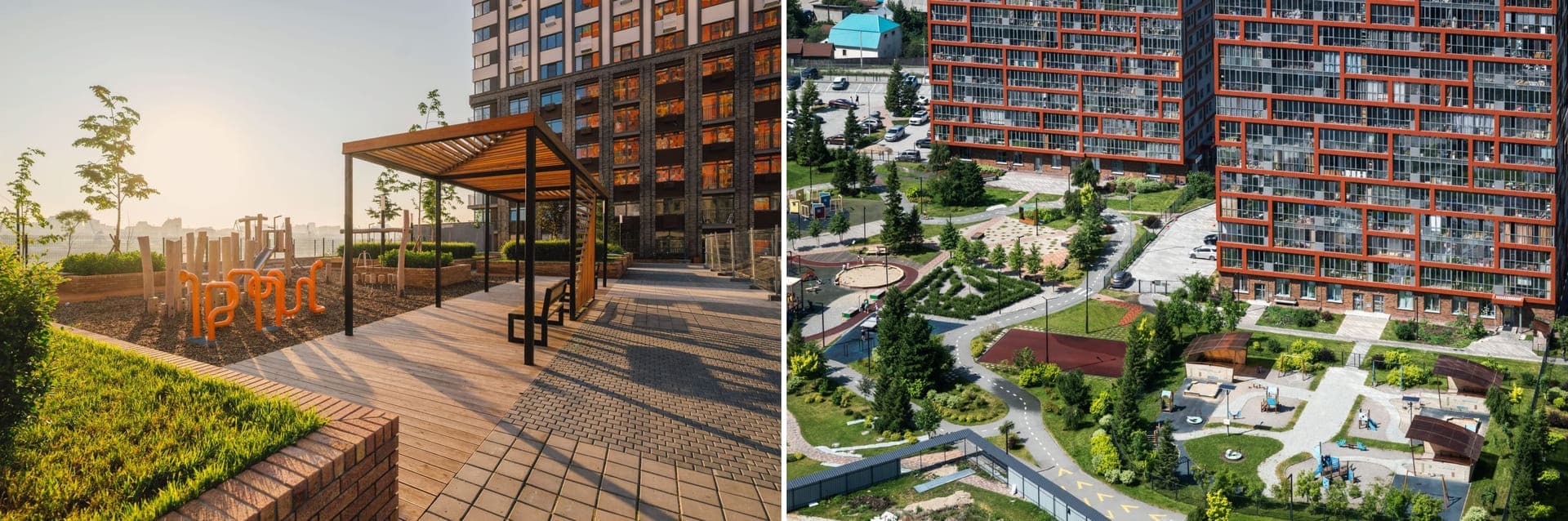 Продуманное благоустройство двора делает его неотъемлемой частью жилого комплекса. Сложный ландшафтный дизайн превращает внутреннее пространство в собственный парк для жильцов, где каждый уголок продуман до мелочей.