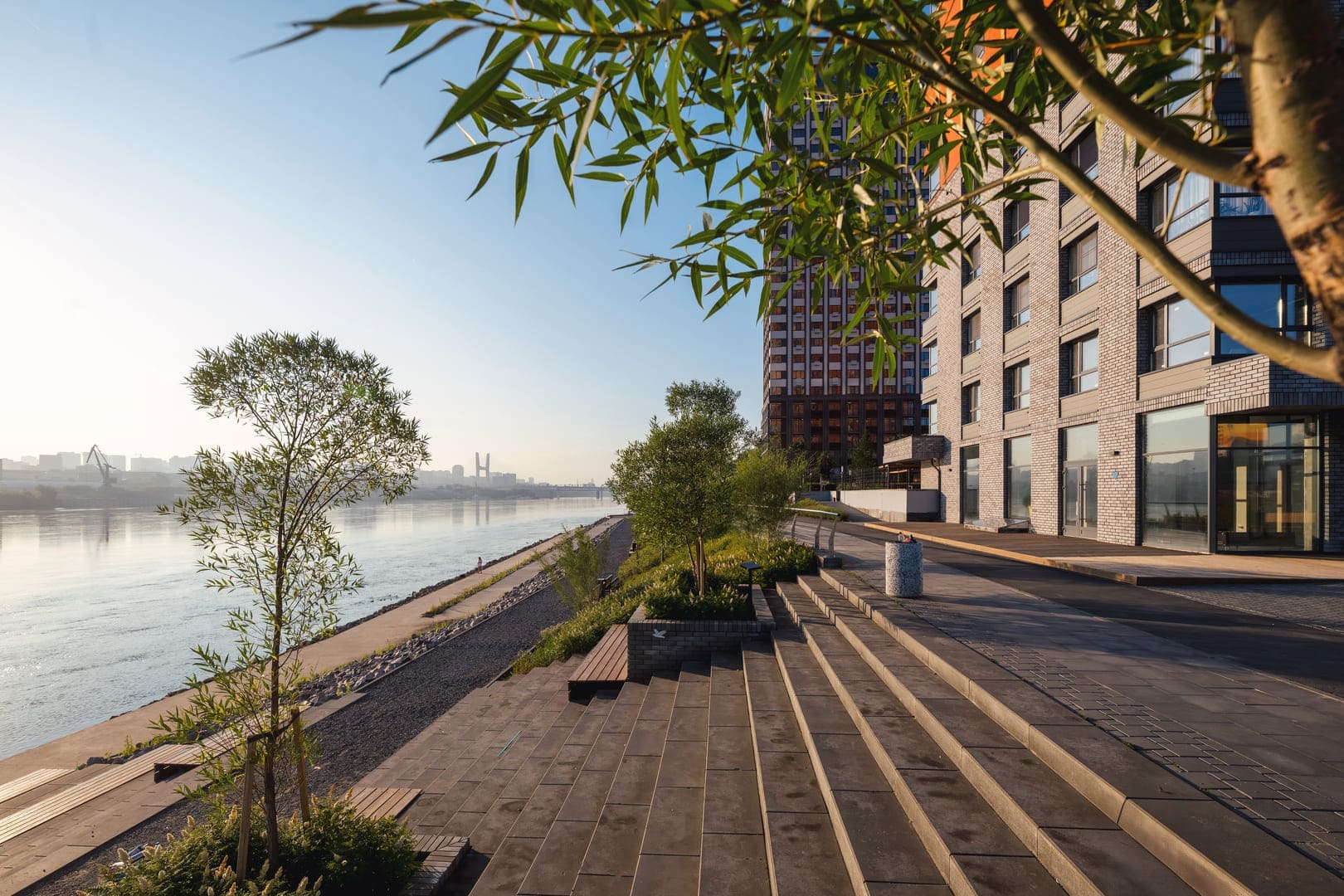 Напротив ЖК «Ясный берег» ведется обустройство набережной протяженностью более 1 километра, которая будет включать в себя пешеходные и велосипедные дорожки, зоны отдыха и спуск к воде. Проект разрабатывался компанией Arteza, которая планирует создать двухзонное пространство: «регулярную» зону, продолжающую архитектуру жилого комплекса, и «пейзажную» зону с восстановленной прибрежной растительностью и уединенными пространствами.