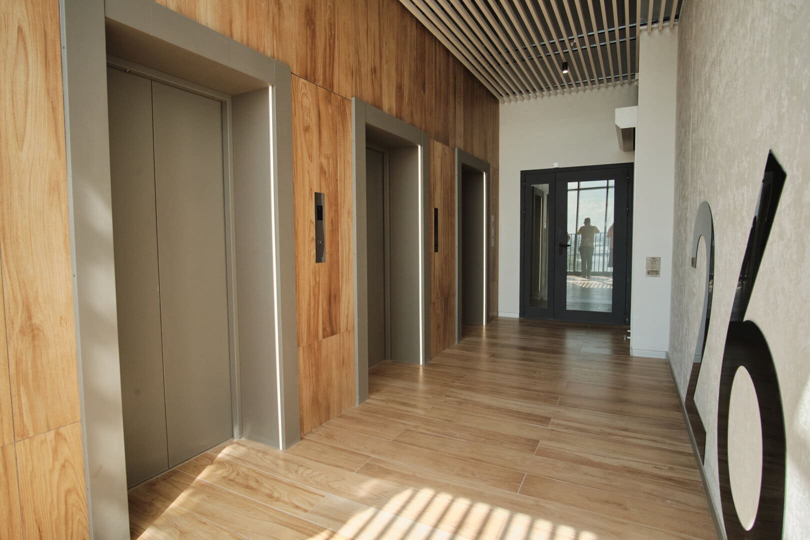 Лифты бесшумные без машинного помещения. Система управления обеспечивает хороший плавный ход и точность остановки кабины.
