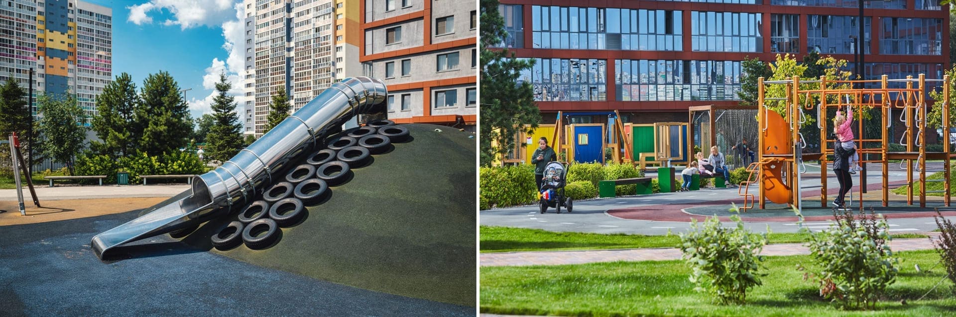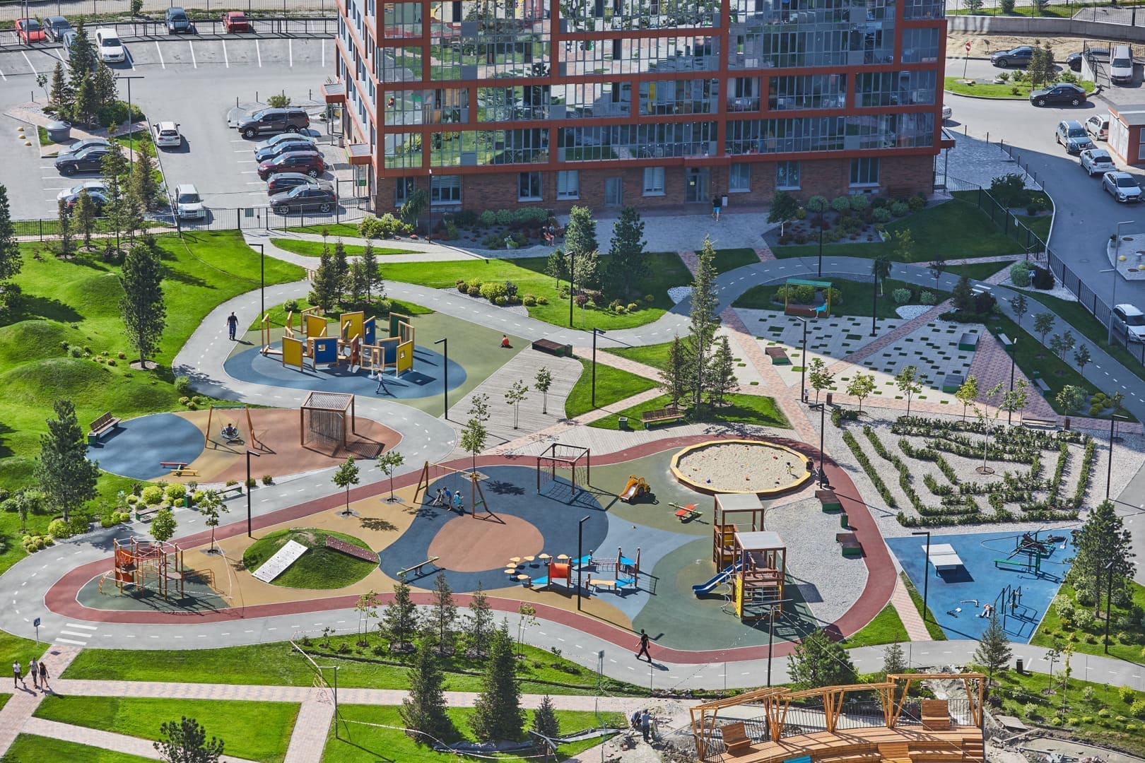 - 9 игровых площадок для детей разных возрастов с безопасным покрытием и современным оборудованием;