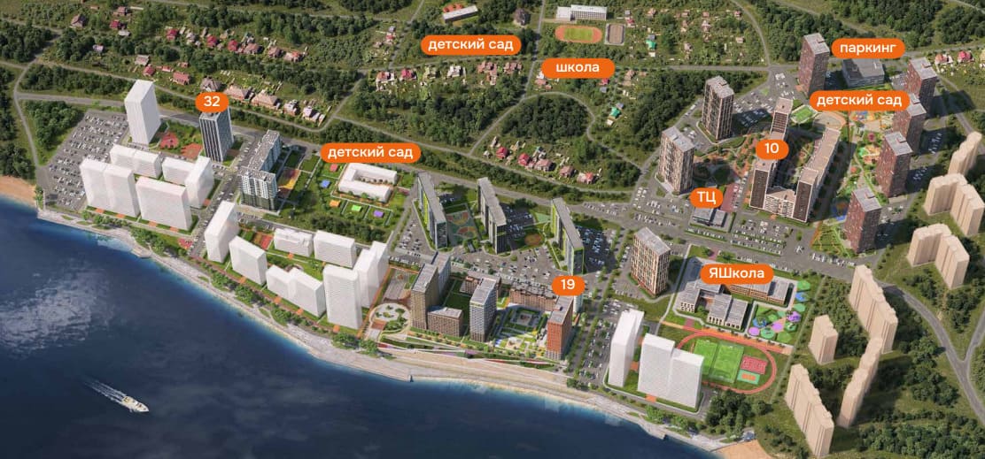 - Дома расположены вдоль береговой линии, что обеспечивает потрясающие виды из окон квартир;