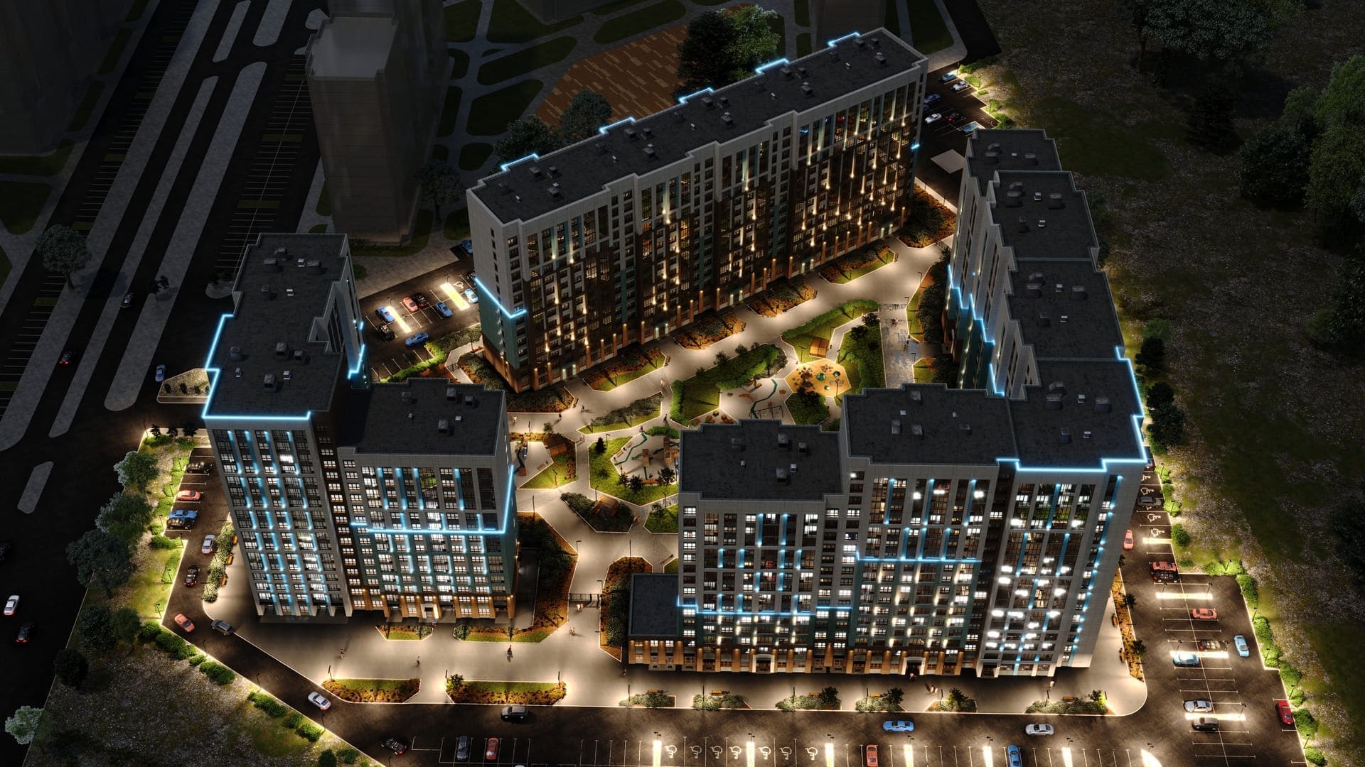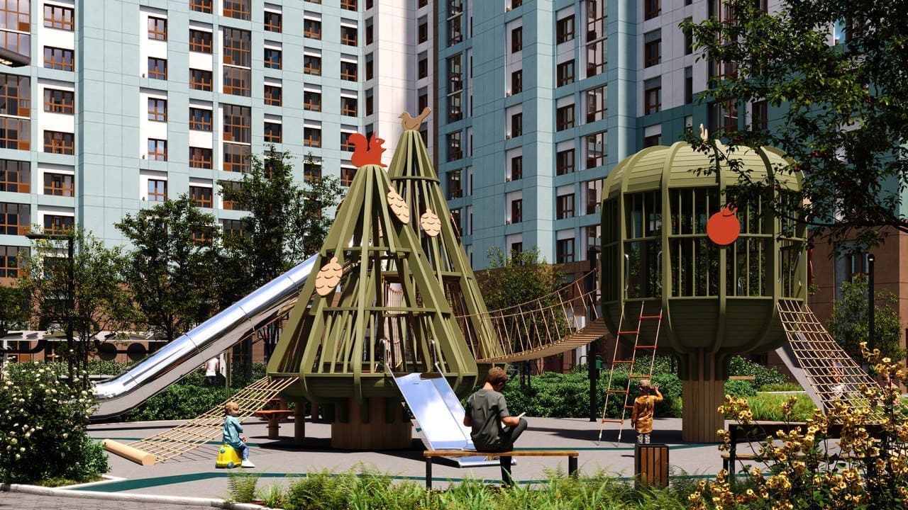 - Объедененную территория закрытых дворов с зонами отдыха, детскими и спортивными площадками;