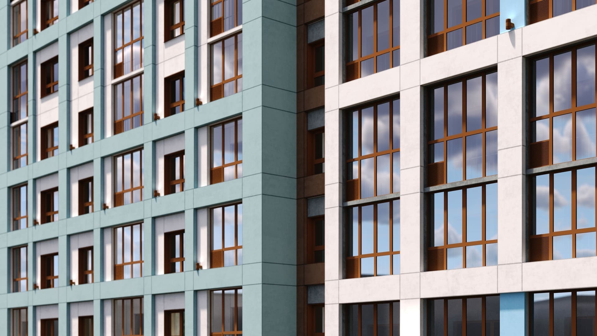 Наружные стены зданий облицованы алюминиевыми панелями с полимерным покрытием, которые стилизованы под цвет бирюзы. Этот выбор не только придает фасадам уникальный и современный вид, но и обеспечивает долговечность и устойчивость к внешним воздействиям.